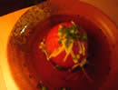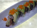 | 私がオーダーした“ホワイトワイン モヒート”は、本来のラムベースよりクセがなくて飲みやすい。友達が注文した“ユズ モヒート”を味見させてもらった。ユズの香りはGOOD!でも、私にはちと甘い。どちらにも言えることだが、ミントの量が少ない。それと、ミントは予め少し潰しておいた方が香りが強くなるのになぁ…ちょっと残念。 この“レインボーロールスシ”には20種類以上の「巻物」がある。 まずはお店のオススメという“ドラゴンロール”を食べる。 うなぎのフライがメインの具をご飯とアボカドで巻き、トビッコが乗っている。うなぎとアボカドはかなり好相性。口の中でプチプチするトビッコが気持ちいいアクセント。巻かれたアボガドスライスの模様が龍のウロコのように見えるから“ドラゴンロール”という事らしい・・・。 他に、ピクルスとご飯を牛のタタキで巻いた“牛タタキロール”など、色んな食材の組み合わせにすごくワクワクして、おいしい発見がいっぱい。 だけど一番気に入ったのは、普通のアボカドスライスをハラペーニョ(青唐辛子)ソースにつけて食べるシンプルな一品だった。 |