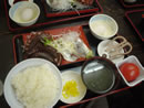 レモンハイと刺身二点盛り定食。 刺身はマグロや生しらすなど7種類から選べる。私は朝獲り“地タコ”と“地アジ”をチョイス。 タコは大きめの足が丸ごと4本ドサッ。そしてアジも開いて皮を剥いただけの状態で出てくる。自分の好みの大きさに切るためにハサミが添えられている。 タコは醤油などつけなくても新鮮な磯の香りで十分楽しめ、アジは単品で頼んだ中トロより美味しかった。 この日は観光客でごった返していたが、たまたま隣に座っていたグループはこの漁港の漁師さんたちだった。 |