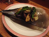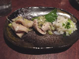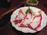 | コースにはないけど、今日は馬刺しがオススメだというので、追加オーダー。熊本に仕事で行って以来、馬刺しに目がない私…ここの馬刺しもおいしいけど、もっと厚めに切ってある方が好きです。 この後、コースに戻り、串焼きメニューが4品。 うーんお腹がいっぱいじゃぁ〜。 しかもお酒のピッチが早かったせいか、酔っ払ったぁ〜4日抜くとちょっと弱くなるのね。。。 |
