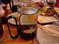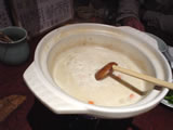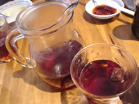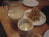 辛いモノは、食べているうちに辛さに慣れて「もっと!」と思うもの…野菜の追加注文と同時に「もっと辛くしたいのですが…」とお願いしたら、真っ赤なペーストがどんぶりで出てきた♪いっちゃえ〜!って感じでドバドバ入れて、ヒーヒー言いながら完食☆ 韓国のお酒“マッコリ”は辛いものを食べて刺激を受けた胃を優しく修復してくれるようです。どんどん飲みましょう(笑) |