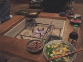 そして居間には囲炉裏があり、すでに夕食の準備を整えてお友達のご夫婦が出迎えてくれました。 今夜のメニューは地物の魚の刺身に、サラダ、ホタルイカの酢味噌和え、ハタハタ一夜干しにエイヒレ。そしてメインは地元で獲れたアンコウを使った鍋です。 私たちはスパークリングワインとワイン2本を持参。 静かでやわらかい夜が更けて行きます。。。 |