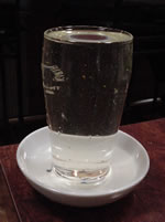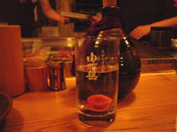 | 後をついて歩くこと2分。 ビルの1Fのちいさな入り口…。目立つのに、知らないと入れないって感じの店構えです。 さて、無事席についた私たちは、早速コラーゲンコースをオーダー。そして焼酎をボトルで一本。水割りセット付きで…。 |