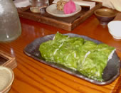 | 続いて2本目は、「天の美緑」&「蓮根とアスパラガスのお茶天ぷら」。 猪口を口先に運んだ途端、爽やかなお茶の香りに包まれます。抹茶を混ぜた衣で揚げた、アスパラ、蓮根との相性もよく、焼酎の特徴を損なわない組み合わせでした。 3本目は、「甕雫」&「飛魚のンジャナー包み蒸し」 “甕から注がれる”という行為で、何となく特別感あるような気がするのは、私だけだろうか…? |