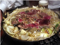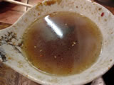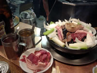 | 子供の握りこぶしほどの大きさの脂を頂点に置き、タマネギ・長ねぎが乗せられる。そして野菜を掻き分けて生のマトンをジューと焼き始めたら、あっヨダレが! 風邪薬をたくさん飲んでいるので、今日はお酒はやめました(涙) 1人前をペロリと平らげた頃、姉たちがこのお店の近くの他のジンギスカン屋にいるとの電話が入った。このお店でもう少し食べたい気持ちをガマンして、タレに番茶を入れてもらう→このスープは同じ事を他のお店でやってもここ「だるま」に敵わない。マジで、ホントっに、激ウマなんです!この〆のために来ている。って言っても過言ではありません。 |