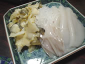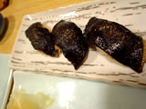 | コレといった面白いメニューがないので、食欲は削がれていたが、一品だけ気になるもの発見!「スミイカの沖漬け」である。いくら白でもワインには合わなかったけど、“ルイベ”(凍っている状態の刺身)のようにシャリシャリした食感と口の中で溶けて、イカのゴロ(内臓)と交じり合った味わいは、酒飲み心をくすぐります☆ たぶん真実はオーダーした後、解凍が間に合わなくて、急いで出したらまだ凍ってた…のだと思うけど、コレはGOODでした。 さぁ明日はいよいよ…うん。楽しみだー! |