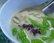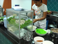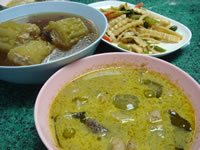 ←お昼ごはん(写真左)は、「ココナッツグリーンカレー」(写真手前)&「ゴーヤの肉詰めスープ」(写真左奥)そして、写真右奥に写ってる野菜炒め・・・筍のように見えますが、ちょっと食感が違う、筍よりやわらかくて、筍よりサクっとしてる、そんで筍のようなクセがない。 |