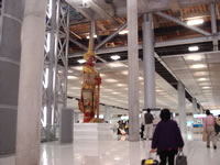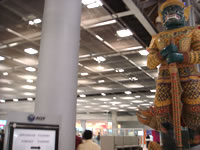 「あさってバンコクへ出発ね。」 そう、そんな勢いで、バンコク行きが決まった。仕事とは言え、飛行機好き・旅好きの私には、めちゃうれしーお話。 そしてあっという間に空の上…いつものように空で飲むワインは、素敵な酔い☆JALだと2本・3本目がちょっと頼みにくい雰囲気あるんだけど、ANAはどんどん持ってきてくれます(笑) さて、タイ・バンコクの国際空港は9月28日から、スワンナプーム国際空港」 に移転しました。 イミグレーションに進んでいくと、どーんとでっかい像が2体…近代的な建物とこの像のアンバンランスさが、“タイ”っぽい感じでなんだか嬉しくなります。 |