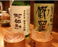 恵比寿「今井屋総本店」へ行きました。 比内地鶏をメインに日本全国のうまい物を集めたメニューはどれも魅力的です・・・が、一部値段の表記がナイ・・・(汗 ともかく、ドリンクのオーダーから、「純米大吟醸 阿部勘」(一杯\2600)と「純米吟醸 櫛羅(クジラ)」(一杯\1600)。 ビールやチューハイは普通の値段なのに、日本酒はかなり高め設定。もちろん手に入りにくいお酒だからなのだと思いますが、高い…感じしますね。 さてこの日本酒ですが・・・大吟醸といえば、清水のようなサラサラしたのをよくのみますが「阿部勘」は、米の香ばしさが立って主張が強い。「櫛羅」は、ふわりと米のフルーティさが香る飲み易さでした。 |