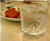 | このお店、今流行りの“カップ酒”の品揃えも豊富だけど、今日は大将オススメの泡盛「久米島」を堪能しました。この「久米島」も先日紹介した「泡波」同様に完全手作りの稀少な泡盛です。味はクセもあり、甘みもあり・・・と、飲み応えたっぷり。だけどそのクセのある甘みは“豚しゃぶ”にも相性がいいです。 ここの豚しゃぶは“海水タレ”という、透明でちょっとしょっぱいタレに浸けて頂きます。お好みで、刻んだネギとゆず胡椒も一緒に…。さっぱりとシンプルなタレだからこそ、豚の旨みをしっかりと際立たせてくれて、これはハマりそう。。。 |