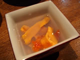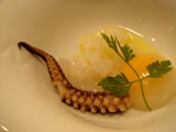 今回まずはじめに登場したのは、「ヤリイカとウズラ温卵」。コリプリとした食感のイカと卵の濃厚なコクが加わって、おかわりっしたい!くらい…のっけからヤラレましたぁ…。 |