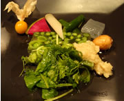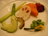 さて、次は「野菜の前菜盛り」…手前にチョコっと写ってる黄色い花のついたキュウリが、めちゃめちゃ美味しかったっ。どの野菜も絶妙な茹で加減で、野菜の甘みがじゅわっと♪ |