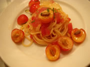 魚の前菜「真ツブ・鯛・あいなめ」海ぶどうやジュンサイなど…一つ一つがメインの素材を引き立てて、食感・味・両方で楽しませてくれます。 この辺りで、すでにワイン(白)飲みすぎ注意報発令!(笑) 1つ目のパスタは、「佐藤錦(さくらんぼ)とフルーツトマトのカッペリーニ」、冷たい喉越しと、さくらんぼの甘みが、ホントったまらん☆アクセントに使われている松の実がまたいいんだよね〜。。。 |