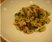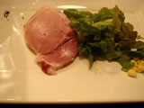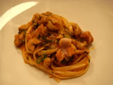 | ここいらで、赤ワインにスイッチ!…でもすでにかなり飲んでいます(汗) 「自家製のハム」「牛内臓をトマトソースで煮込んだパスタ」どちらも見た目よりさっぱりとして、やわらかく、口の中でほどけるぅ〜。 |