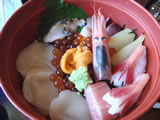 さて、ここでのオススメは平磯焼(¥4000)という母に従いオーダー(くぅ大奮発!)。 生きた「鮑」に「バフンウニ」をのせて網焼きに…熱さに身悶えながらグリグリ動く様から“残酷焼”とも言われます…本当に苦しそう(;。。。 掌くらいある大きな子持ち「ボタンエビ」と「イカ」を除いて、「ホッキ貝」「ホタテ貝」「タラバ蟹」「北海タコ」「青ツブ貝」全て生きてました。中でも「タコ」の美味さに脱帽…。 〆は名物「海石榴(ツバキ)丼」。これまた新鮮なネタがぎっしり…この丼に手を出した時は既にお腹いっぱいだったのに、ネタの美味さに気がついたらバクバクっっ。 |