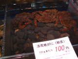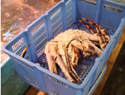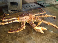 | タラバ蟹は、生簀に15匹ほどいました。中から好きな大きさを選んで、その場で釜茹でしてくれるのです。 写真→は、そのうちの一匹2.6Kサイズの大物。 生簀から引揚げられそうになると、ジタバタ凄い勢いで暴れます。 この先の運命を知っているのでしょう…(;床に置いた途端、排水溝へ向って後ずさり…私がカメラを向けると、思いっきり大きな爪を振りかざしました。 |
