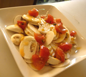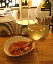 | 昨夜、「世田谷BAL」のマスター・高城さんに、「明日、富山直送の新鮮な魚貝が入るんで、よかったらまた!」と、無邪気な笑顔で送り出され…… てへへ、今夜もまたきちゃった。 特別メニュー「カルパッチョ」を頂いたあと、「エビとイカとフグのトマトソースさっと煮」を食べました。 鮮度がいいものは、生で食べるのがイチバン!では、ありますが…トマトソースと魚介の共演もグ〜☆ 昨日飲みすぎたから、今夜はほどほどに…と思っていたんだけど…美味しい肴にどんどんワインはなくなり… 「もう1杯おかわり〜♪」 |