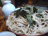 | しっかり漬かった「野沢菜」と「ワサビの葉の醤油漬け」、通しの「しそ漬け」つまみに、そばを待ちます。 それにしても、「野沢菜」は、東京で食べるものと全く味わいが違うんですよね…コレ齧りながら何杯でも呑めそう☆ホントっサイコーに旨い! そして真打…「そば」…今年は“ざる”にしてみました。このサイズで小盛りなんです…めっちゃボリューミー☆ でもおいしくってツルっと食べちゃうんだなぁ… |