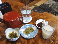 相方の実家・信州へきております。 信州に来たら、必ず寄るお店が、佐久市「藤蔵屋」さんです。郷土料理も扱っているので、お盆とお正月は、帰省の方が多いらしく、いつもとても混んでいます。 そば焼酎をグラスで頼むと(←写真一番上の透明な液体)コップに大盛で出てきます。これを別のコップに移して、濃厚なそば湯で割っていただきます。(←写真右手前の白濁の液体) |