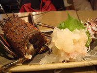 お世話になっている脚本家の先生と、フットサル仲間で女優の中村高華ちゃんと、鮮度のイイ魚介で人気のお店・下北沢「とぶさかな」へ行きました。 「とぶさかな」へは、以前から、行ってみたい!と思っていて、何度かチャンスがあったのに、タイミングが合わず…でも、今夜は常連さんで、お友達のご近所マダムの紹介で席をGET! 入口には、本日のオススメ…伊勢海老とタラバ蟹がまだピクピクした状態で、お出迎え〜 |