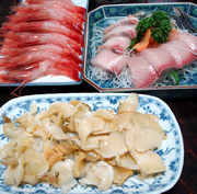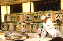 「地酒と料理の夕べ2009」に行ってきました。 蔵元34、さらに酒メーカーさんなどを加え、46社の協賛の大きな会でした! 会員価格の入場料5000円で、紅ズワイ刺し・サザエの煮物・おつまみ弁当…さらに、生ハムやローストビーフを食べられるクーポンがつき、各酒蔵のお酒が飲み放題…もちろん大吟醸も☆ さらにさらに!マグロの解体ショー! 捌かれたマグロの中トロ・大トロなどの部位をオークション☆ 私は中トロを柵を500円でゲットしました〜美味しかった♪ |