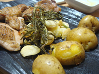 月初めに北海道に行っていた時、収穫されたばかりのジャガイモ「北あかり」を買ってきた。 今夜は、相方も私も大好きなジャガイモ料理で、 ウチゴハン。。。 「地鶏とジャガイモのフライパン焼きローズマリー風」 …皮目からパリっと焼いた地鶏に、皮のまま茹でたジャガイモと、ニンニク&ローズマリーを加えて、オリーブオイルをかけて焼くだけ… とても簡単だけど、ローズマリーとベストマリアージュなジャガイモが、地鶏の旨みを吸って、ノケゾル程、抜群にウマイっ☆ |