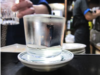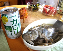 | 北海道に住む姉が、再び、今度は出張で上京。 「ケジャンが食べたい」とのリクエストだったんで、 今夜は、新大久保「カントンの思い出・別館」へ。 私たちがお店についたのは、閉店2時間弱前。 人気店だけど、既にほとんどの人が食事を終えて“飲みモード”。店員さんも、すでに片付けモード。 私は「キュウリ焼酎」(たくさんキュウリの千切りをチャミスルをつけると、さわやか飲み口になる。ヤカン入り)。 姉は、 「ビール」→「シャーベット・マッコリ」 (写真左↓) |