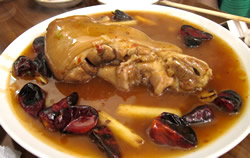 | 人数が多い時でないとオーダーできない、 ボリューム満点の「豚スネ肉の丸ごと蒸し煮」が、テーブルに運ばれてきた時、思わずだらしない程、嬉しくてたまらんニタニタ顔になった(^^; トロトロに煮込まれたスネ肉を食みながら、 紹興酒を啜る。 「健康で食事を楽しめる」って素晴らしい! |