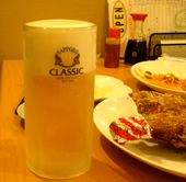 | さて、“クリスマスイブ飲み会”スタートっ! 北海道限定ビール「サッポロ CLASSIC 生」で、私の札幌在住の友人と、相方と…カンパイ♪メリークリスマス! 今夜の特別メニューは、「鶏の骨付きモモ肉のザンギ」、「刺身盛り合わせ(ツブ・タコ・ホッキ貝・ボタンエビ)」。 この日の私たちの予約に、市場から仕入れてくれた刺身は、抜群の鮮度☆☆☆コリコリでプリプリ♪ “ザンギ”は北海道弁で唐揚げのコト…醤油や生姜で味付けされた鶏のモモは、ほどける軟らかさ♪ そして、通常メニューからオーダーしたのは、相方のお気に入りで、以前、札幌に来た時に母宅で作ってもらった「おかんのナポリタン」(450円)&「餃子」(250円)。 |