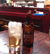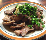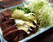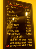 | 「焼酎とホッピー白」をオーダーすると、 お通しという「白菜漬け」が登場。それと「レバ刺し」(450円)でスタート。 ほとんどのメニューは、4〜500円で、それぞれのポーションも多めなので、食べ応えがある。ニラのみじん切りと、すりおろしにんにくが、オーダーしたどの料理にも乗っていた。 メニューの表記はドイツ語が使われていて、例えば「タン焼き」は、「ツンゲ焼き」や、「子袋」は「ウルテス」など…と書かれているのもオモシロイ☆ プチ観光気分で、お断りせずに料理写真を撮って、ご主人に注意されてしまったが、その後、吉田類さん撮影話などしてくださった…気さくなご主人の感じがステキだ。 |