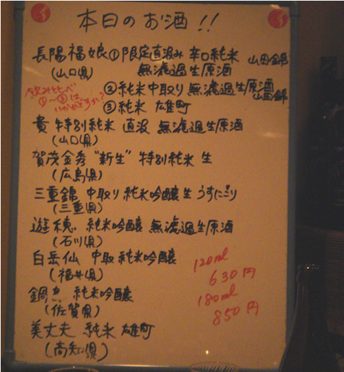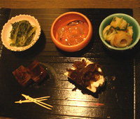 | 飲み放題の内容が"店にあるお酒なんでも!”っていうからがニクイっ!その響きが呑み助心を鷲掴みっ! まずお通しセット ・水菜のおひたし ・塩辛 ・ちくわのさっと煮 ・煮凝り ・冷奴と茗荷の佃煮 からはじまり、自家製の干物(今夜はのどぐろ)など、私のツボな酒肴が出てきました。 日本酒のラインナップも、焼酎のラインナップも、そしてビールも、定番系は少なく、「おっ!コレあるんだ!」って、思わずテンションあがるような一捻り効いたものが多い。 |