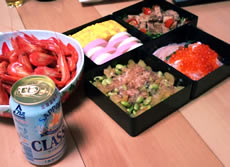平成23年 元旦。 今年のお正月は実家へ行こか!と、相方と話していたのだけど、ギリギリまで予定が定まらず、自宅でのお正月。 毎年お願いしている経堂「美登利寿司 圓」さんのお節のオーダーも間に合わず、既製品と手作りとで用意したら、自分の好きなモノだらけになってしまった(笑) ・かまぼこ・出し巻き ・数の子&ひたし豆 ・北海ダコ入りのなます ・豚ロース西京焼き ・北海シマ海老 |