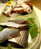 2月に「せいこ蟹」を買った、最近お気に入りの魚屋さんで、今回は「生タコ刺し」(350円)を買って帰った。 袋を開けてみると… なんと「タコ」の他におまけで「コハダ」が入っていた! この「コハダ」、いい締め具合♪ 旨みがお酢でギュっとなっていて、ウマイ!!! もちろん「タコ刺し」もプリプリで、ウマイ!!! そんな美味しいお刺身たちと合わせる今夜の酒は、 |