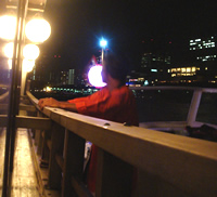 6月23日 タイから、友人の川崎夫妻が東京に来ました。 川崎さんの美人奥様・タイ人のギフトちゃんは、2008年に行ったタイ・バンコクで、とてもお世話になり、いまでも仲良しの大切なお友達☆ そんな川崎夫妻と、「もんじゃ屋形船 千羽丸」に乗ってきました! 勝どきの桟橋に船が着いて乗り込むと、まさに“江戸っ子”な船のお姉さんから、飲み放題の缶ビールを受け取り、乾杯!停泊ゾーンまでは、持ち込んだ枝豆や乾き物をかじりながら、グビグビ… そして、停泊ゾーンに到着すると、レインボーブリッジやお台場を見ながら、もんじゃ食べ放題スタート! |
