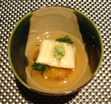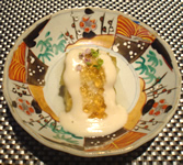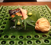 | 3品目「鰆の焼き物」 焼きの塗り醤油の塩梅なのかな…魚の旨みがドーンと引き出された美味しい焼き魚。“ほおずきトマト”は、甘みと酸味と複雑な旨みで、トリップします。 4品目「ジャガイモの揚げ団子とアナゴ蒸し おかひじき添え」次から次と繰り出される個性豊かな味のハーモニー♪ |
