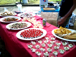 今年もこの季節恒例の“相方誕生会”☆ 毎年の会場だった“cafe Cherir”は、昨年、惜しまれつつ閉店。 今年は、その“cafe Cherir”近くの公園で、ガーデンパーティーを企画したものの準備の相談すらなかなか進まない状況でした。 …でも、そんな私に助け舟を出してくれたのは、“cafe Cherir”の店長さんで、毎年本当にお世話になっていた“ジョーさん”。 「美味しくてイー感じのケータリング用意しますよ〜♪」 …そして当日。 ←コレがセッティングされていました☆ もぉー!スゴイ!カワイイし、バケットに乗せてタパスのようにつまんで食べるから、小物もかなり少なくて、心配してたゴミも軽減。 |