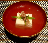 | 1品目「焼き茄子の胡麻ソース」旨みを引き出しつつ、きっちり冷やされた焼き茄子の“焼き香”の香ばしさと胡麻の香りで食欲↑↑ 2品目「百合根と海老のしんじょう」出汁からぷっくり顔出した“しんじょう”、箸でつまんで口に入れると、ホロホロに解けて旨みがパーっと広がりました。 |