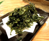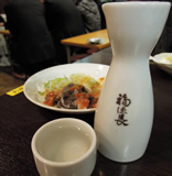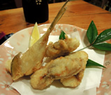 | お店のママさんのお母様が、海女さんという事で、串揚げの店なのに、魚介のメニューが豊富。 「刺し盛」(1000円)、「地サザエ造り」(650円)、「セルカキ」(500円)と、生ものを肴に熱燗をクイ。。。 さらに、「焼き大アサリ」(500円)をハフハフしながら食べて、殻に酒を流し込み啜る。。。 「ふぐの唐揚」(600円)、「青さ天ぷら」(450円)にたどり着く頃には、熱燗のとろんとした酔っ払いの完成。 聞こえてくる話し声の訛りの音が心地いい。 “旅に出た”という気分が盛り上がる。 |