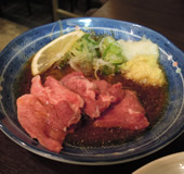 | 不完全燃焼で向かったのは、こちらも類さんが江戸川橋で紹介していた「やきとん みつぼ」。ここは、高田馬場店。 “混んでて入れない”のウワサ通り、早い時間にも関わらず席はほとんど埋まっていた。 こちらでも「温燗」をオーダー。 最近は、生のお肉が食べられるお店が減ってしまい、生肉LOVERの私はとても寂しい思いをシテイマス。 …なので、“つぶしたて”がウリのこの店では、まず「タン刺し」をいただきました。 |
