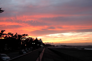 朝6時半起床。 宿から歩いてすぐの「夫婦岩」。 この季節、岩の間を登ってくる朝日はみえないとの事で残念。。。 でも真っ暗な世界が徐々にピンク色に輝きだして、暖かい太陽の光がふりそそぐ。 最高の朝時間でした。 |