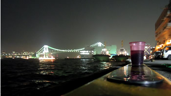 | 花火が終わって、撤収作業が始まっても、帰りたくないほど、イイ雰囲気の日の出埠頭。 「赤ワイン&ソーダ」(スペインでは“ティントデベラーノ”という)のカクテルをクピクピ飲みながら、しばし海の匂いとお台場の夜景を楽しむ♪ 来年も来たいなぁ☆☆ |