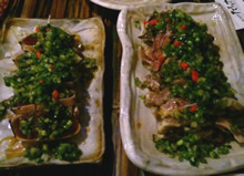 今夜は、「腸詰」をつまみに、「青島ビール」から。 ビールの後は、紹興酒「越中王」。 初めて飲む紹興酒です。甘さ控えめですっきりしてて好み♪こりゃグビグビだぁ。。。 「北京ダック」は、しっかり巻かれて登場しました。4人前くらいの量だそうで…2人で食べるには、ちょっと多いわぁ。。。 中華はやはり大人数でくるべし。だな。 |