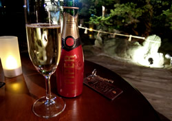 | 夕食を終えて、大浴場へ行くと、ロビーラウンジでは、古い映画が上映されていました。 お風呂上りの1杯に、シャンパーニュをいただきましたよ。 相方と二人、のんびり映画を見ながら、あらためて乾杯!! この歳も“嬉しい”いっぱいのスタートです☆ |