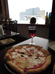 スキー場のイタリアンレストラン「アルピナ」で、軽い打ち上げ〜! 山頂にピザ釜があるなんて、びっくりしました。 本格的な焼きたての熱々ピザ〜。冷えた体がほっこり温まりましたよ。 食事の後、下山する頃には、吹雪いてきました。 下山ルートは、滑走幅が狭くて、視界もあまり良くないし、ワインでほろ酔いの私には、なかなかハードでした。…っていうか、途中でしっかり酔いが冷めた。。。 みなさん雪山のお酒には要注意ですよ!! |