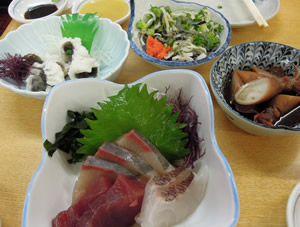 「刺し盛」、「鱧の湯引き」、「ふぐの皮ポン」、「子持ちヤリイカ煮」、「鶏の煮込み」。 |