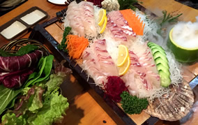 ◆お刺身セット(中)は、 「おかず3種」 「ケジャン」 「サラダ」 「海鮮チヂミ」 「平目か鯛の刺身」 「野菜セット」 「魚のアラ鍋」 …がついて、全部で4980円☆ 1人前ではなく、このセットがこの価格なので、4人で食べれば、1人あたり≒1250円…安い♪ みんなでフィリピンの思い出話で盛り上がりました〜♪ |