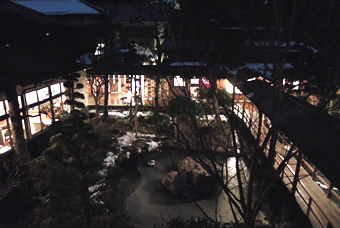 靴を脱いで、中に入ると、 外観からは想像つかない、洋風でレトロモダンなロビー。 年季の入ったソファーは、 しっかり手入れされていて、ランプの温かい色調が優しい。 窓の外には、氷の張った池と庭が見渡され、回廊でつながった離れが。 お正月の繁忙期を少し外した時期なので、 静かでゆったりした時間が流れていきます。 |