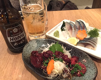 「恒例の高田馬場」 年に一度、「一陽来復」の御守を授かりに、 早稲田にある「穴八幡宮」へ行く。 毎年、その後、早稲田や高田馬場で1杯飲んで帰るのが、楽しみにの一つで、毎度どのお店に行こうか、前日は遠足前の子供の気分♪ 一軒目は、「ニュー浅草・高田馬場店」。 16時には“もう飲める”ようになってしまい、すぐに入れたのは、こちらでした。 寒い日だったけど、ホッピーはやっぱりウマイ! 「しめ鯖」は普通(笑)。でも、「桜肉の漬け」(辛味噌)は、ツボったぁ☆☆ |
