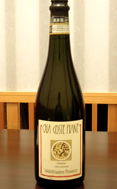 | 続いて、夕食〜。 夕食は食事処で、半個室の席に案内されました。 このホテルに決めて、ネットでクチコミを見てたら、ラウンジ&レストランのお酒が高い!との事。 (ちなみにグラスの生ビール800円越えでした…汗) なので、お酒は持ち込みました(持ち込み料1500円+税/1本)。 …だって、今日は私の40歳の誕生日。 好きなお酒を心ゆくまで楽しみたいです☆ イタリア・ヴェネト州のビオ・スパークリング 「CASA CostePiane Prosecco」。 |