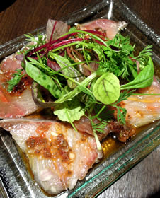| 「初・俺の…&フラメンコライブ」 今日はご近所飲み友でフラメンコ友達のライブを見るため、赤坂「ノベンバー・イレブンス」へ。 ライブスタートより、少し早めに赤坂到着♪まずは1杯! テレビなどで話題になってる「俺のフレンチ・イタリアン」に入ってみました〜初☆ 「シードル」をオーダー。 突き出しは「クレームブリュレ」。 「ブリのカルパッチョ」、程よく脂の乗った大きな切り身と、ドライトマトのオイルがイイ感じ♪ テレビで取り上げられていた“原価率120%”という、“フォアグラ”、“伊勢海老”は売り切れていて…残念。。。 |
