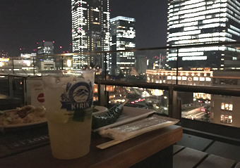最後は、今日8周年イベントがある「新丸ビル」へ来ました。 美味しくてオシャレな9店舗が入る「丸の内ハウス」での8thイベントでは、 特別メニュー食べ放題+3ドリンクのチケット =¥3000。 CPかなり高いです!! ただ、15時半から呑んでる私たちはすでに満腹(笑) 「きゅうりの1本漬け」、「中華クラゲ冷製」…など軽いおつまみと、「レブヒート」(ドライシェリーのソーダ割り)をGETをして、東京駅の夜景を見渡せるテラス席でのんびり乾杯! |